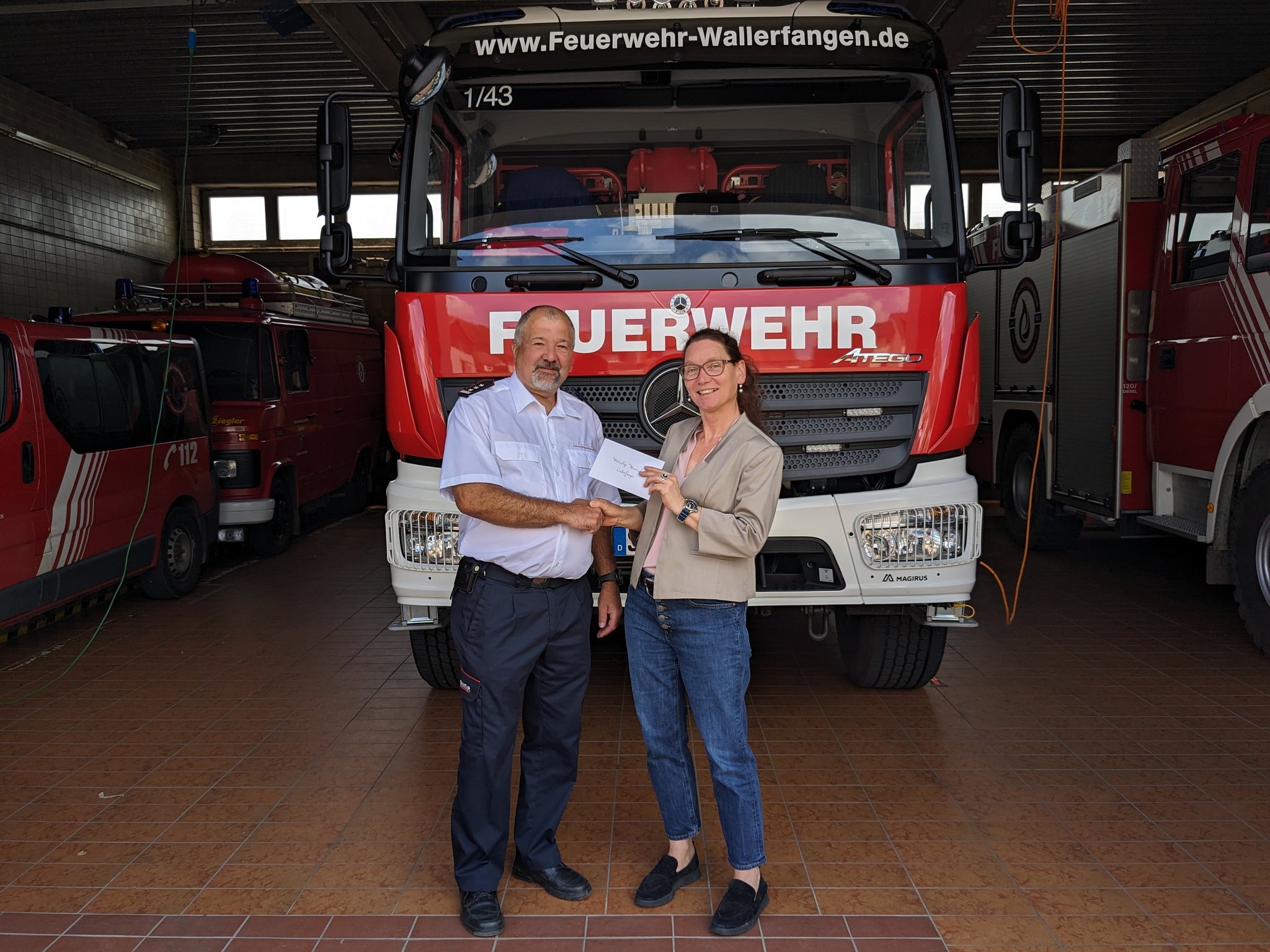 Mit einem kulinarischen Gutschein sowie Getränken im Gepäck besuchte Sie die freiwillige Feuerwehr von Wallerfangen. Sie traf dort Herrn Bauer, Wehrführer der Gemeinde Wallerfangen und Herrn Minor, stellvertretender Wehrführer.